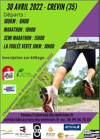 | 30 Apr 2022 | 100km de Bretagne - Le Semi-Marathon Crevin (35) 21.1KM - Route ARCHIVES DE CETTE COURSE Tps moyen : 01:50:22 publiée avec accord |