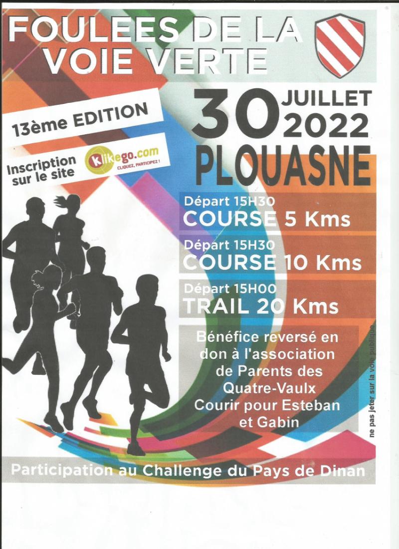 | 30 Jul 2022 | Foulées de la Voie Verte Plouasne (22) 10KM - Route Nature ARCHIVES DE CETTE COURSE 1 avis Tps moyen : 00:56:44 publiée avec accord |